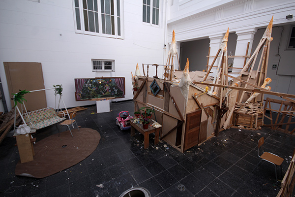 What León & Cociña present in this yard of the museum is a true exercise of artistic sustainability. They have not only occupied objects and materials found in the cellars of the building, but have also reused part of works previously shown by other artists. They have raised this Castle of Purity (Castillo de la Pureza), a sort of indigent version of the Disney Castle.